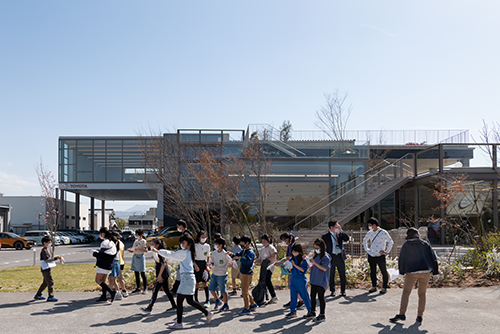 松山市番町小学校の生徒さんと、2021年秋に松山城で拾い集め育てていただいた苗木および弊社や建築設計事務所の矢野青山建築設計事務所さんに育てていただいた苗木を植樹しました。